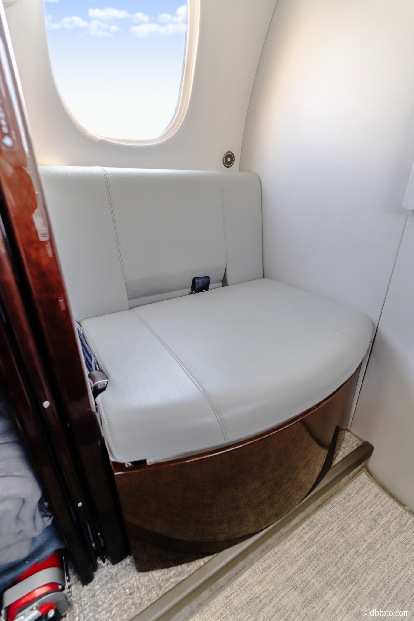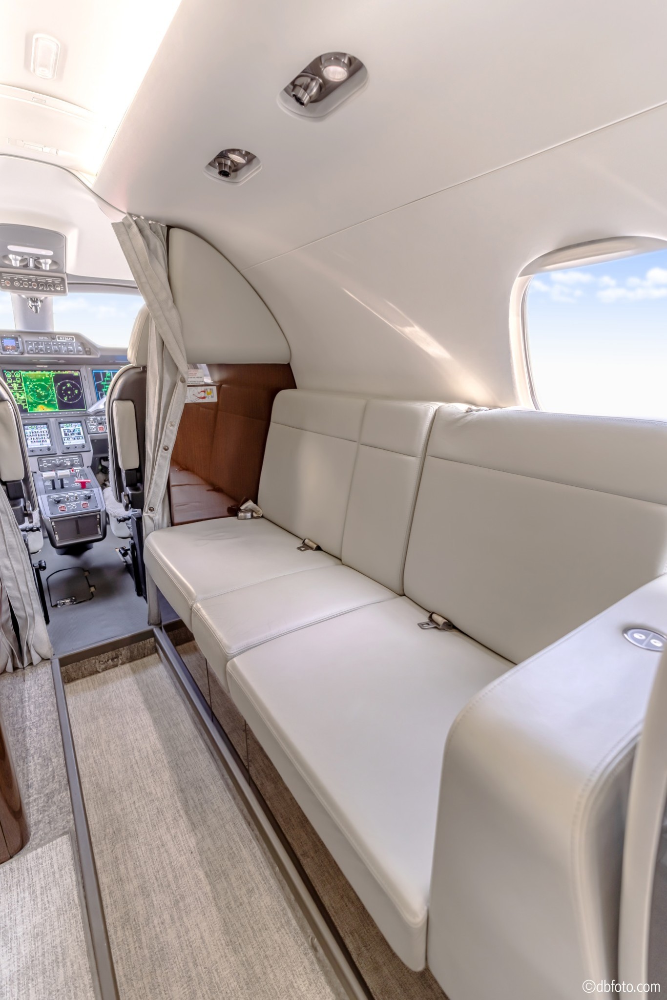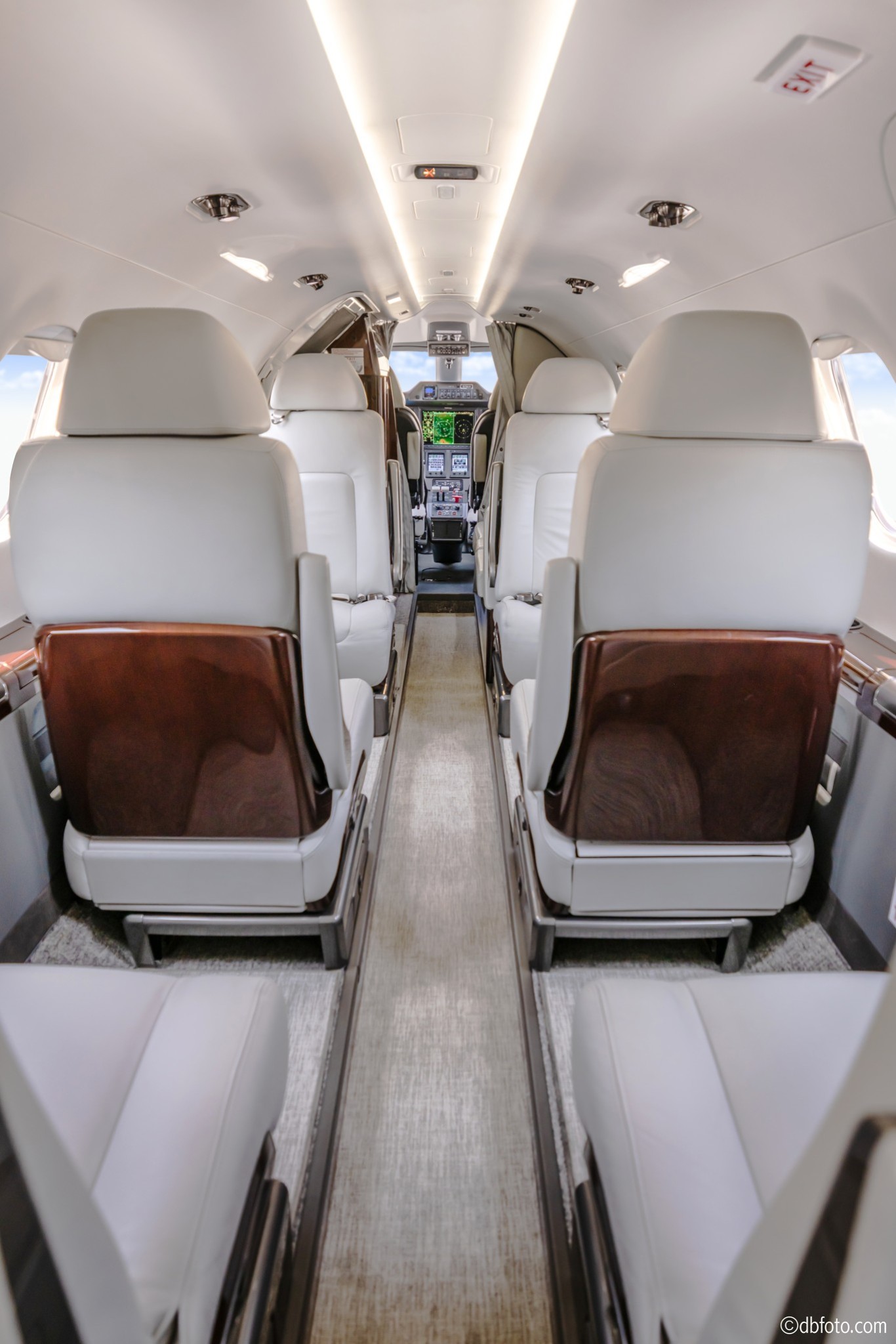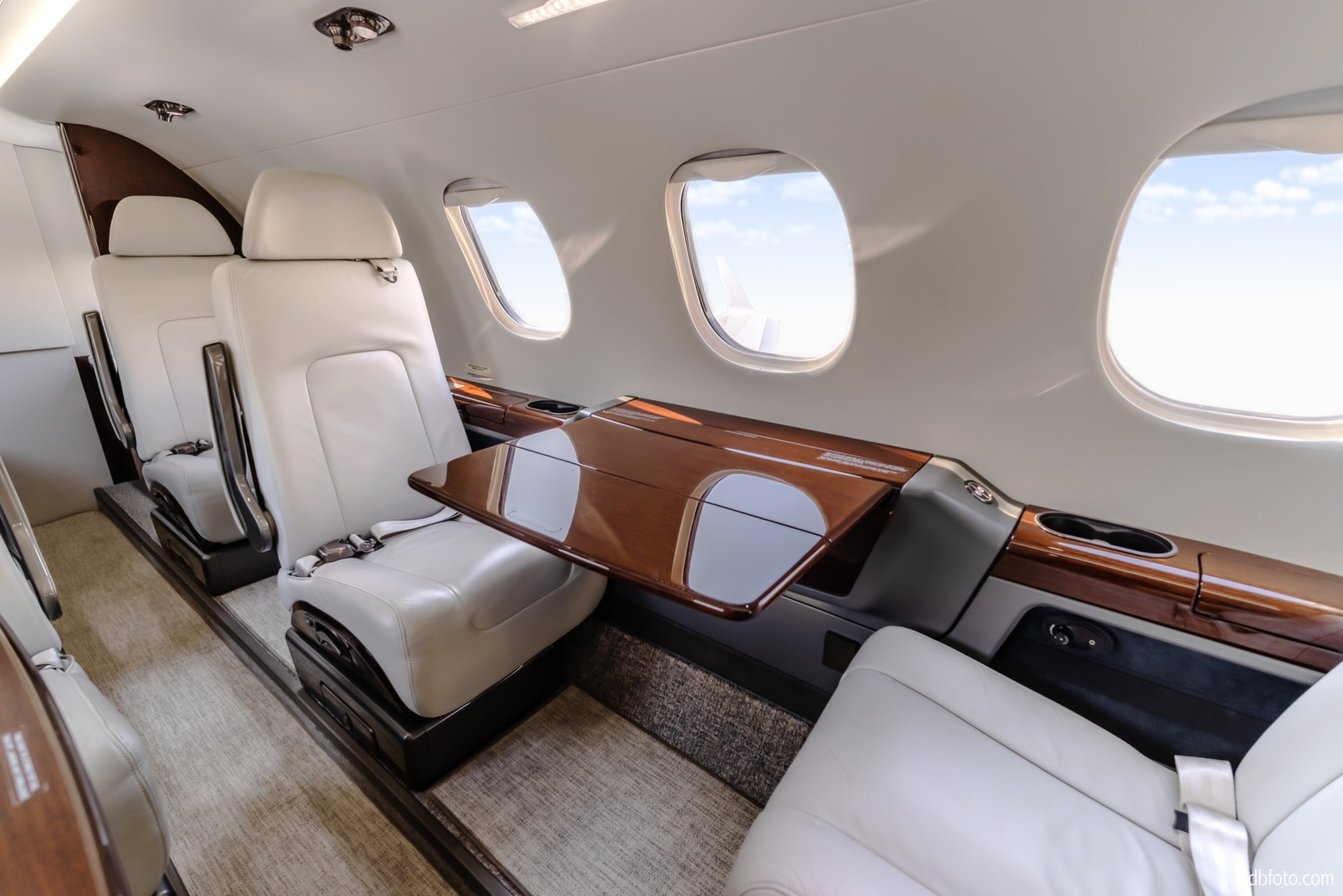 A cabine possui 9 assentos, sendo 6 poltronas em couro e 1 lavatório com cinto e divan diateiro de dois lugares. A aeronave possui sitema de entretenimento à bordo e acabamento em madeira natural